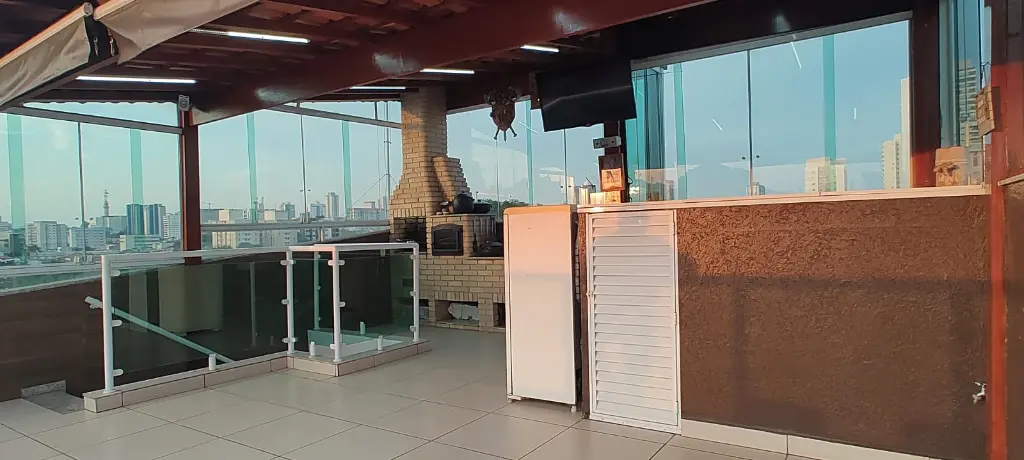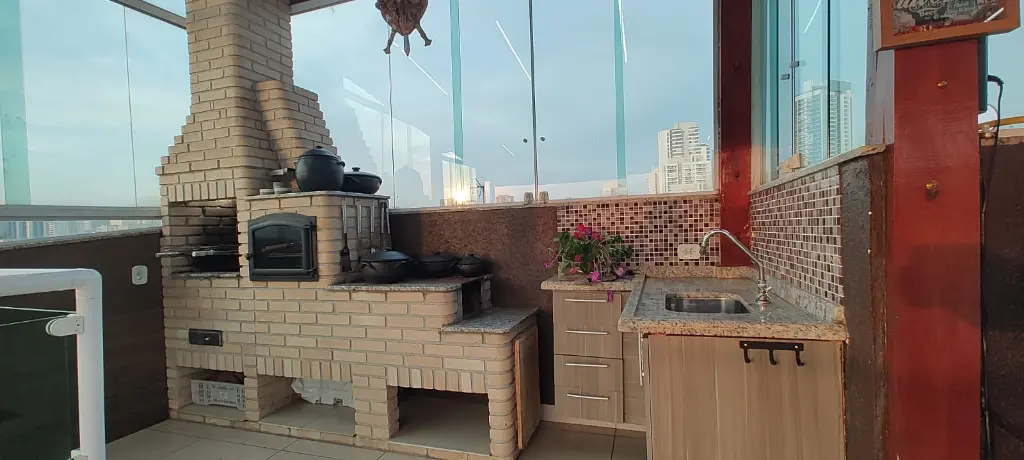 Terraço feito na medida para um belo conforto em suas respectivas comemorações com espaço gourmet, churrasqueira de alvenaria, pia e fogão à lenha.