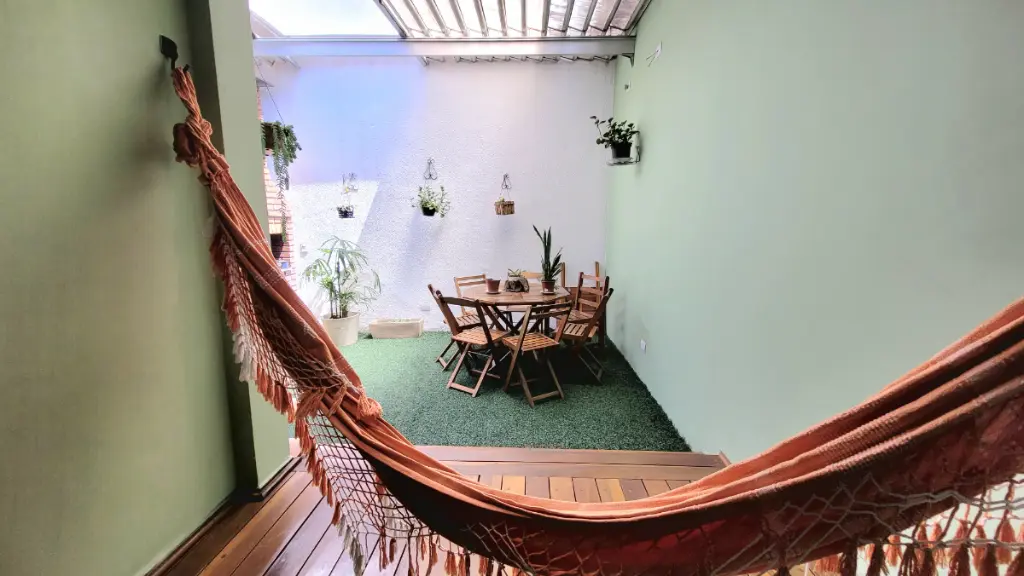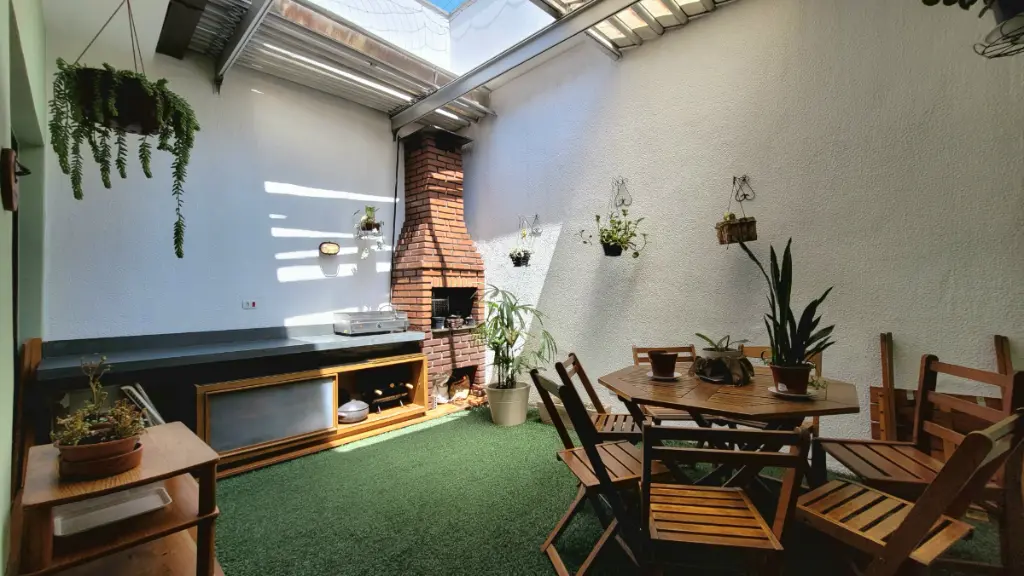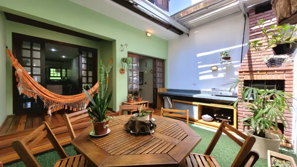 Seguimos para a sala de jantar, que possui portas de vidro que integram o ambiente à deliciosa área gourmet. Pensada para o lazer, ela conta com o charme prático da grama sintética, a cobertura flexível do Zetaflex, uma churrasqueira para seus eventos e o ponto perfeito para instalar uma rede, garantindo momentos de puro descanso.