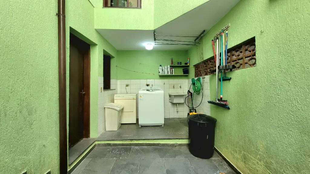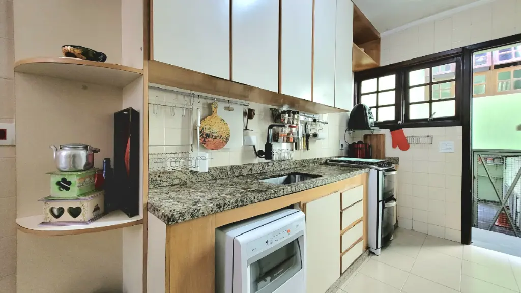 Neste mesmo andar, a cozinha se destaca pelos armários planejados e o acesso estratégico à lavanderia, a uma suíte de serviço (quarto de funcionários) e à garagem com capacidade para 3 veículos.