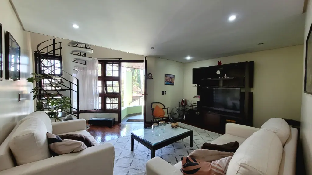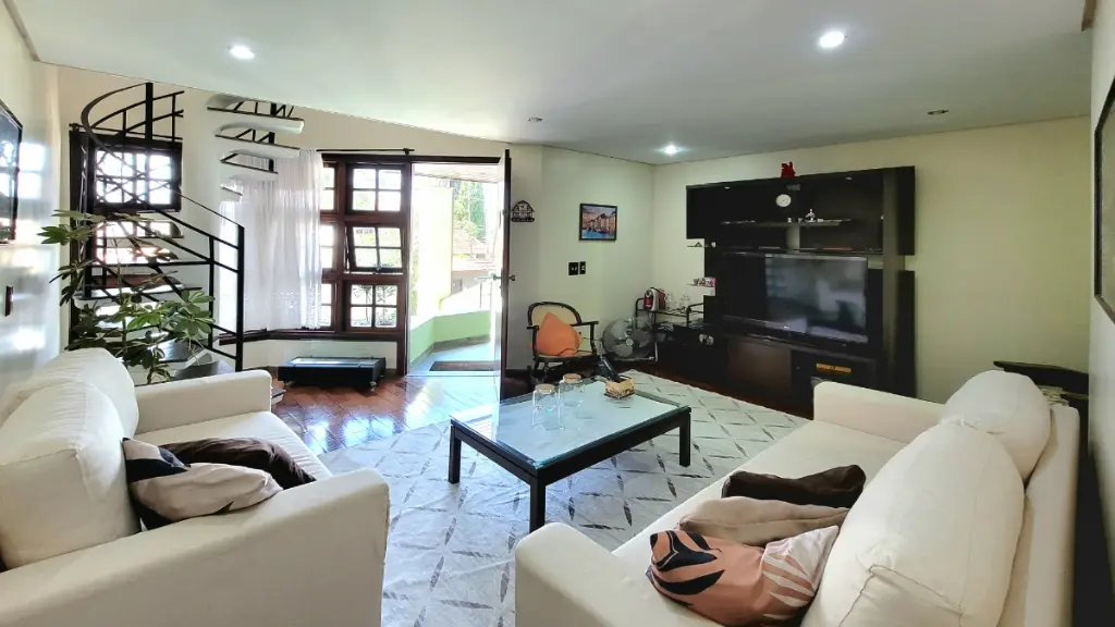 Ao subir a escada, você é recebido pelo pavimento social. O espaço é inteligentemente dividido: uma sala principal de boas proporções e uma sala secundária dedicada ao relaxamento, leitura ou conversas mais íntimas.