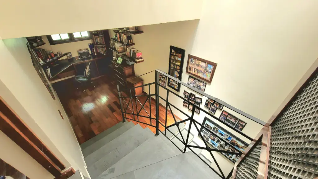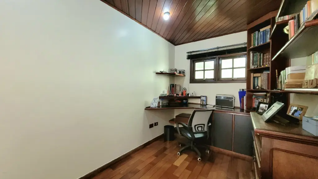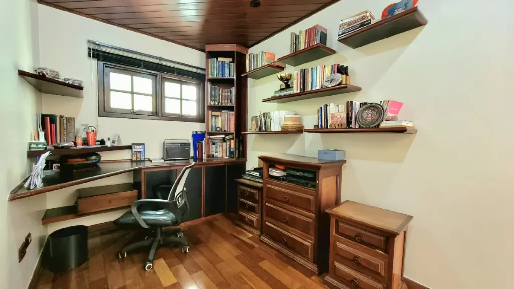 No andar superior, a funcionalidade encontra o charme no escritório, um espaço ideal para a produtividade em casa. Subindo mais alguns degraus, chegamos à área privativa: