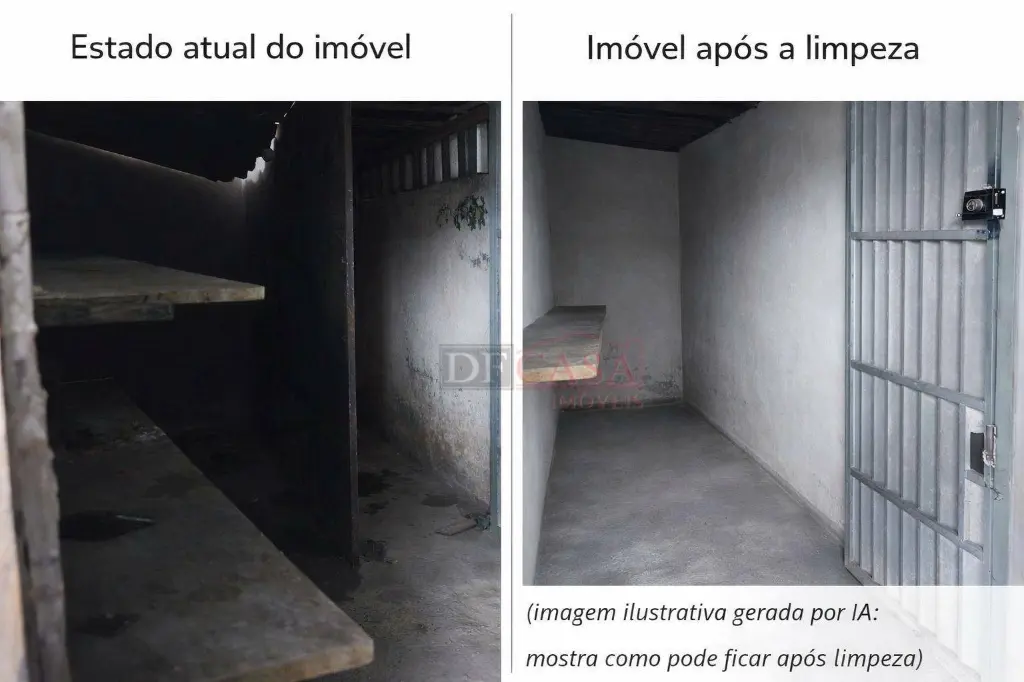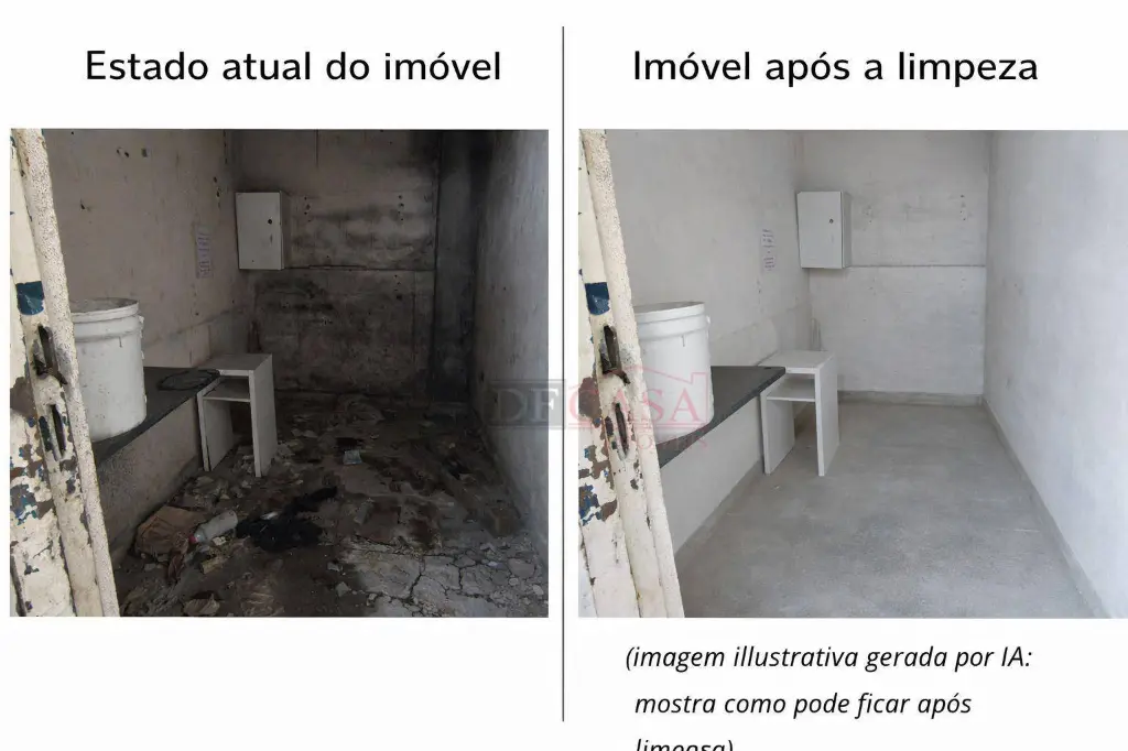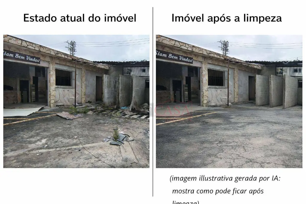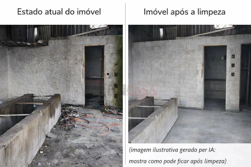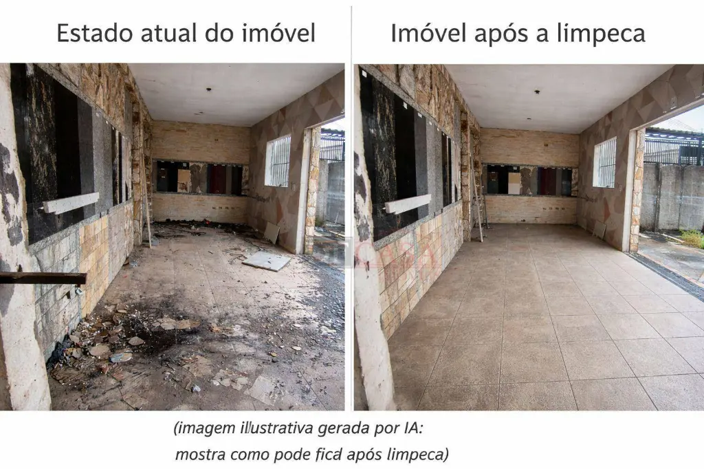 O anúncio conta com imagens do estado atual do imóvel e imagens ilustrativas de simulação após limpeza, geradas com apoio de inteligência artificial, com o objetivo de demonstrar o potencial de aproveitamento do espaço, sem descaracterização estrutural.