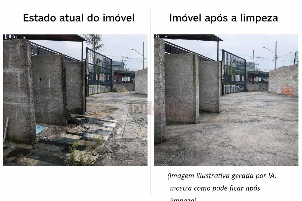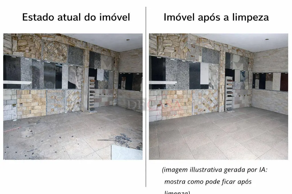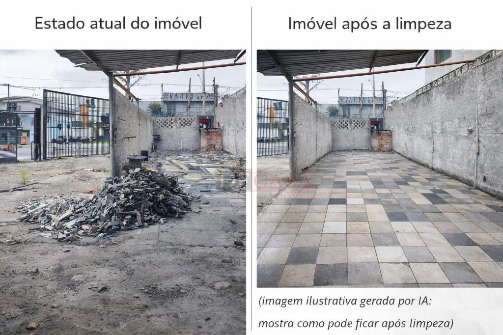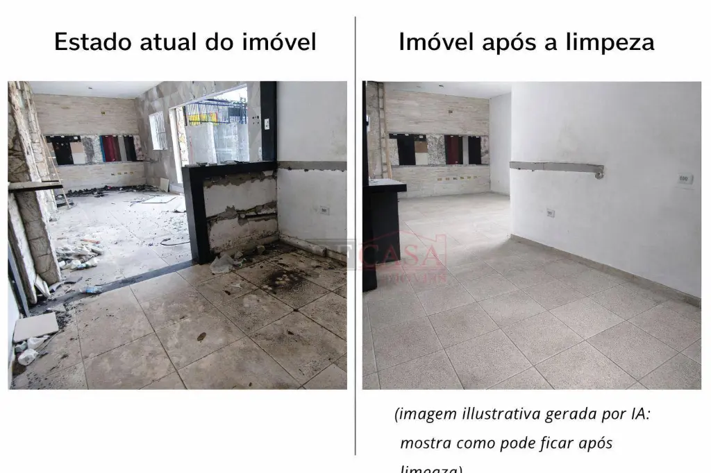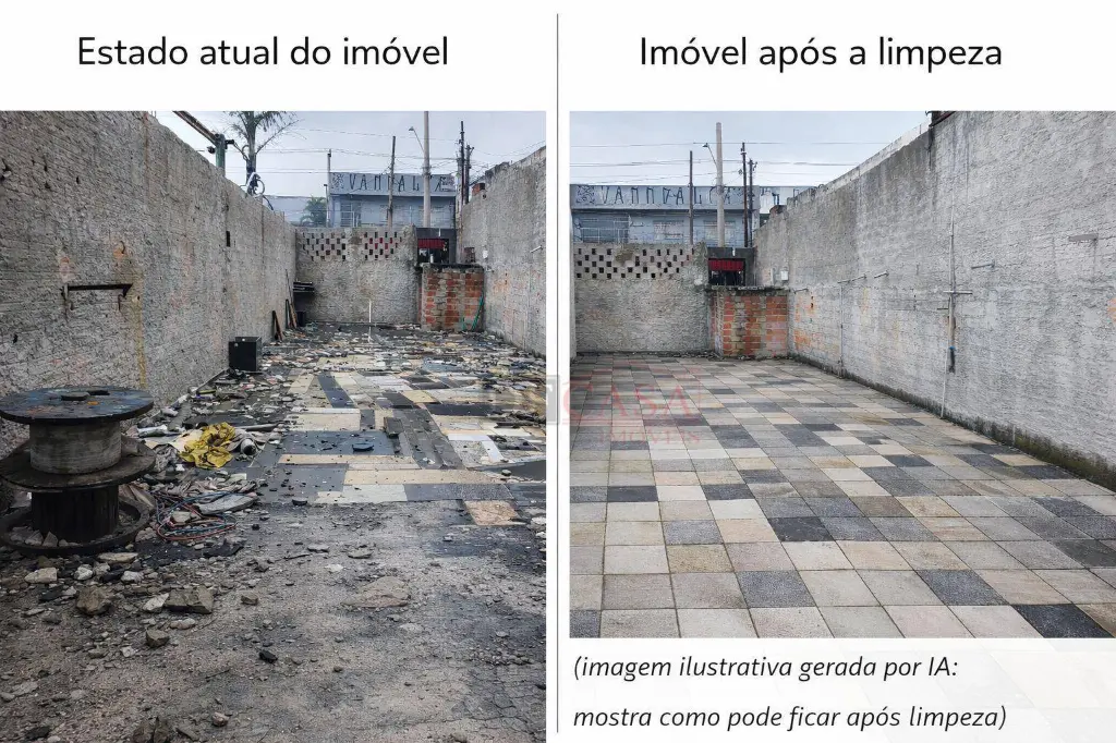 O anúncio conta com imagens do estado atual do imóvel e imagens ilustrativas de simulação após limpeza, geradas com apoio de inteligência artificial, com o objetivo de demonstrar o potencial de aproveitamento do espaço, sem descaracterização estrutural.