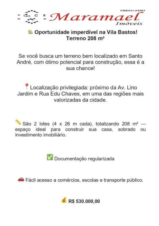 Se você busca um terreno bem localizado em Santo André, com ótimo potencial para construção e documentação pronta pra transferência, essa é a sua chance!