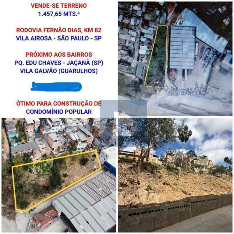 Excelente terreno com 1.457,65 m², em excelente localização, próximo aos bairros: Parque Edu Chaves, Jaçanã, Vila Galvão - Guarulhos. Ótimo para construção de condomínio popular.